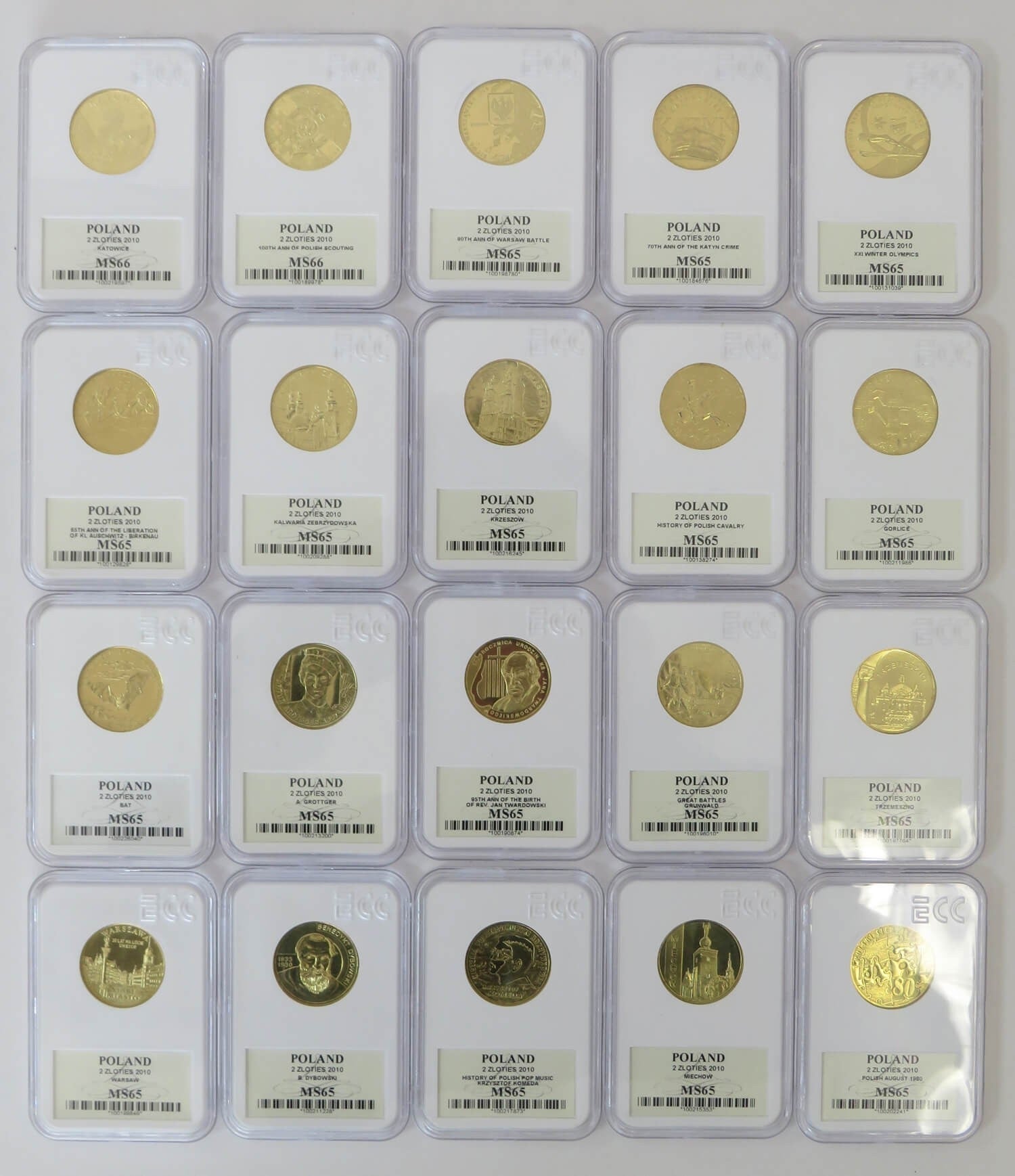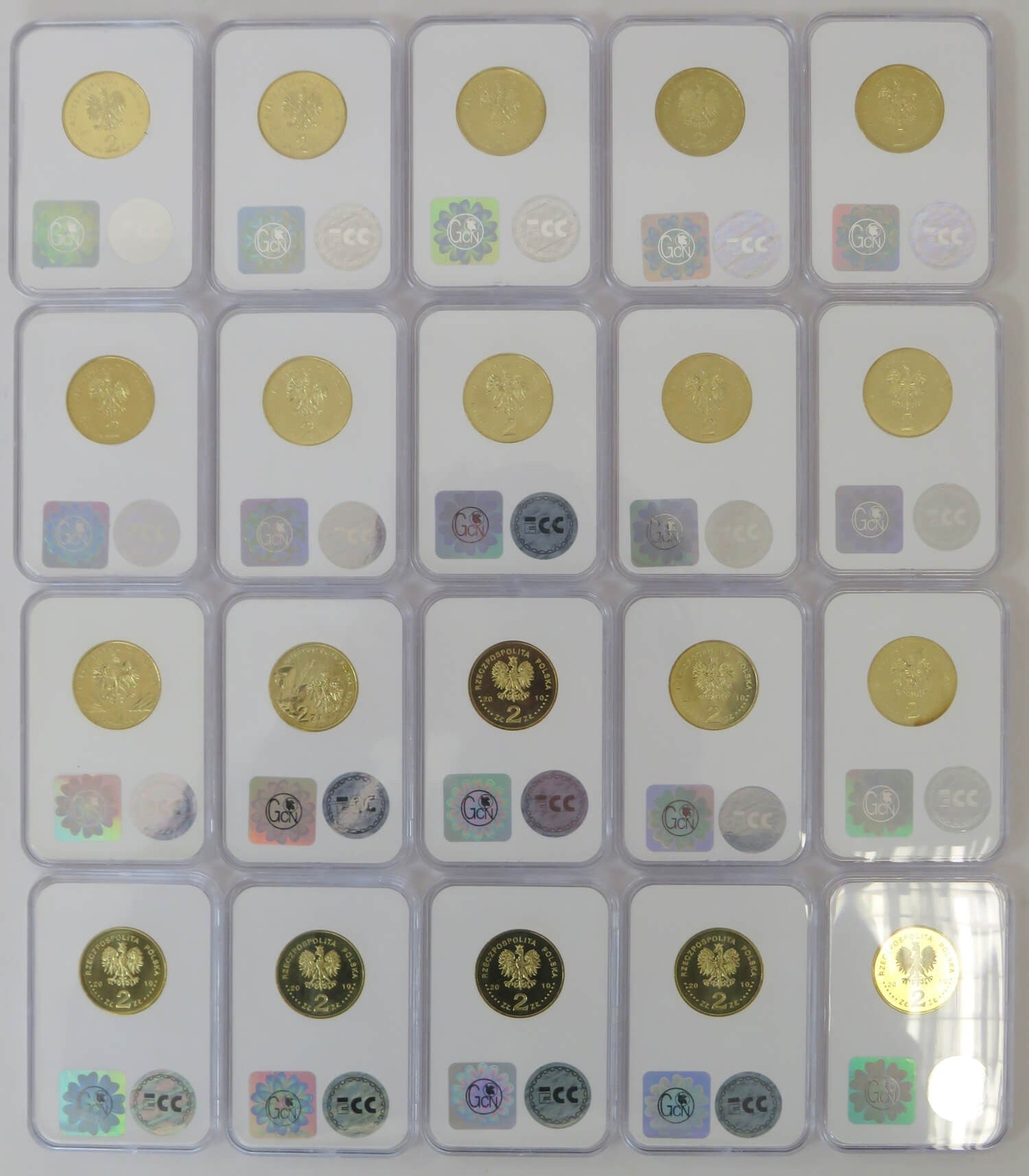 Pełny komplet 20 monet 2 zł GN rocznik 2010, grading GCN MS65-MS66, mennicze