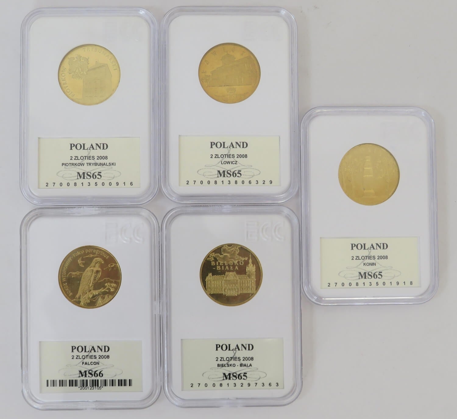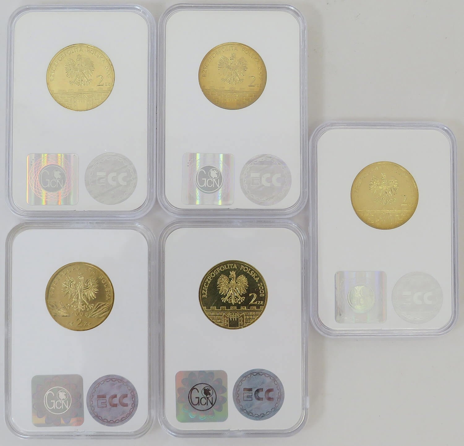 Zestaw 5 monet 2 zł GN rocznik 2008, grading GCN MS65-MS66, mennicze